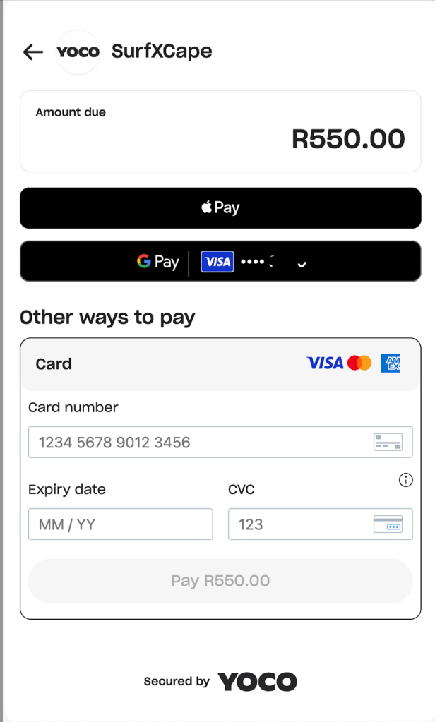 We offer payments with PayPal and YOCO. If you choose to pay with YOCO, you’ll be offered to pay via Credit Card, Google Pay, Apple Pay or EFT (works internationally).